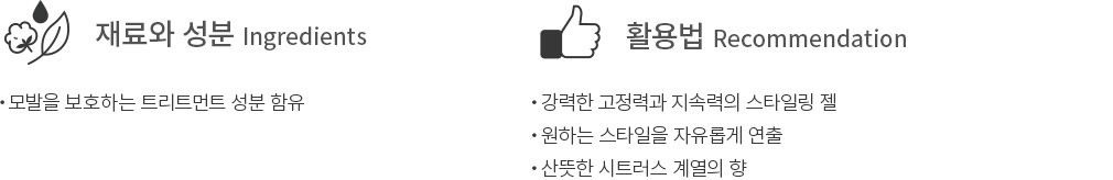 02. 스타일링 젤 웨트&하드 ・특징 : 모발에 젖은 듯한 윤기를 부여해주고, 헤어 스타일을 강력하게 고정해주는 스타일링 젤입니다.