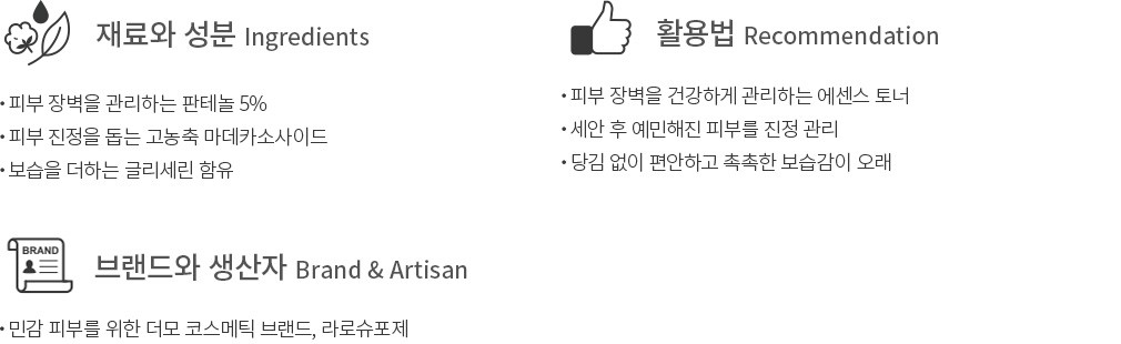 ・ 사용감 : 끈적임 없이 빠르게 흡수되어 부드럽게 마무리돼요. 오랜 시간 당김 없이 피부가 편안하고 촉촉해요.