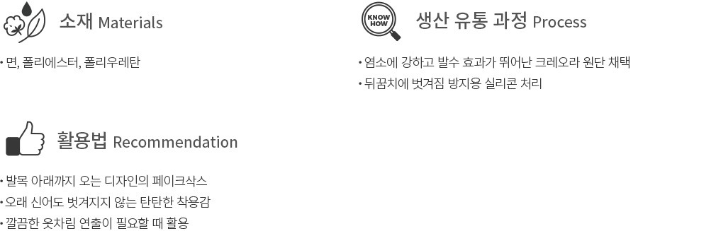 ・특징 : 발목 아래까지 안정감 있게 감싸주는 페이크삭스에요.