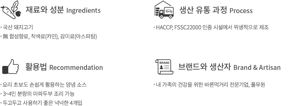 * 대두, 밀, 돼지고기, 쇠고기, 닭고기, 조개류(바지락) 함유 - 본 제품은 계란, 우유, 메밀, 땅콩, 고등어, 게, 새우, 복숭아, 토마토, 호두, 오징어, 조개류(굴, 전복, 홍합 포함), 잣을 사용한 제품과 같은 제조시설에서 제조하고 있습니다.
