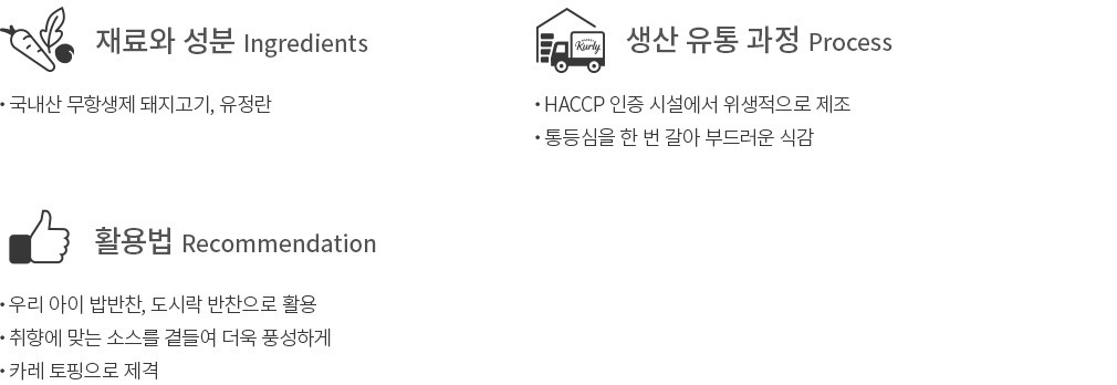 -계란, 우유, 대두, 밀, 돼지고기, 쇠고기 함유 -이 제품은 메밀, 땅콩, 고등어, 게, 새우, 복숭아, 토마토, 아황산류, 호두, 닭고기, 오징어, 조개류(굴, 전복, 홍합 포함), 잣을 사용한 제품과 같은 제조시설에서 제조