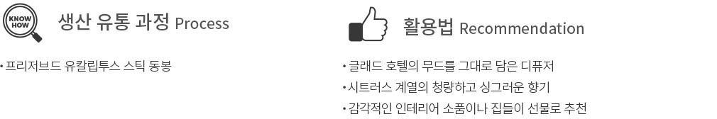 ・특징 : 시트러스와 풀잎이 어우러진 맑고 싱그러운 향이에요. 공간을 산뜻하고 청량한 분위기로 채워줍니다.