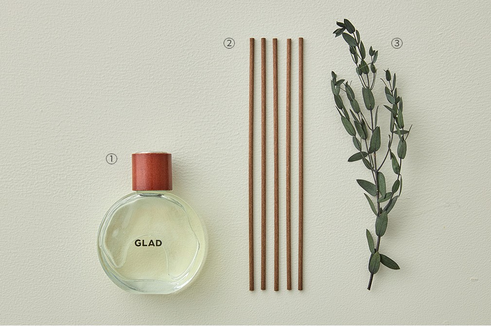 글래드 포레스트 디퓨저 (제주형) ・구성 : ①디퓨저 본품 1병(150mL), ②섬유 스틱 5개, ③프리저브드 유칼립투스 스틱 1개