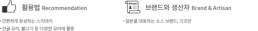 활용팁 ・ 기꼬만 스키야키 소스는 그대로 사용하셔도 좋지만, 취향에 따라 물에 희석해 즐겨도 좋아요.