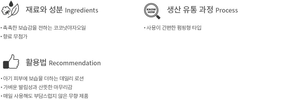 아기 피부의 경우, 피부 장벽이 약하고 얇기 때문에 수시로 보습을 채워주는 것이 중요한데요. 컬리는 데일리 로션으로 사용하기 좋은 존슨즈의 화이트 로션을 준비했어요. 코코넛야자오일이 피부에 충분한 보습을 전해주고요. 가벼운 발림성에 끈적임 없는 산뜻한 마무리감을 지녀, 자주 발라줘도 답답함이 덜하답니다. 향료를 첨가하지 않은 무향 제품이니 더욱 안심하고 사용해보세요.