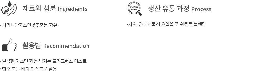 사용법 ・ 몸에 향기가 필요할 때 헤어나 바디에 뿌려보세요. 은은한 향이 기분 좋게 맴돌 거예요.