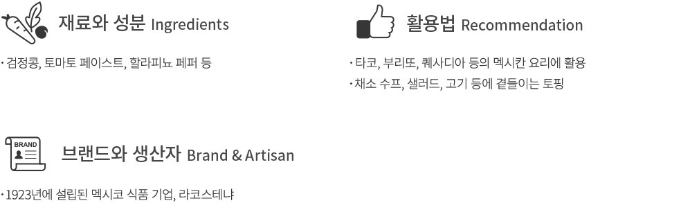 멕시칸 푸드를 먹을 때면 항상 등장하는 재료가 하나 있는데요. 바로 담백한 콩 조림이에요. 콩의 부드러운 식감이 멕시칸 푸드의 매력을 더욱 살려주곤 하지요. 이번에 소개할 제품은 90년 이상의 전통을 가진 멕시코 브랜드, 라코스테냐의 홀 블랙 빈스입니다. 푹 익힌 검정콩에 토마토 페이스트와 할라피뇨 페퍼 등을 더해 깔끔한 감칠맛을 완성했어요. 집에서 만드는 멕시칸 푸드가 왠지 심심하게 느껴졌다면, 라코스테냐의 홀 블랙 빈스를 더해 보세요. 멕시칸 푸드의 진짜 매력을 느낄 수 있을 거예요.