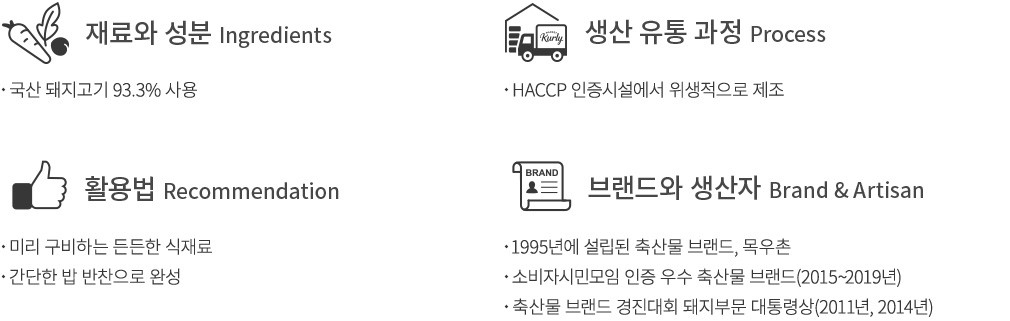 - 돼지고기, 대두, 우유, 밀 함유 - 알류, 토마토, 쇠고기, 닭고기, 조개류와 같은 시설에서 제조