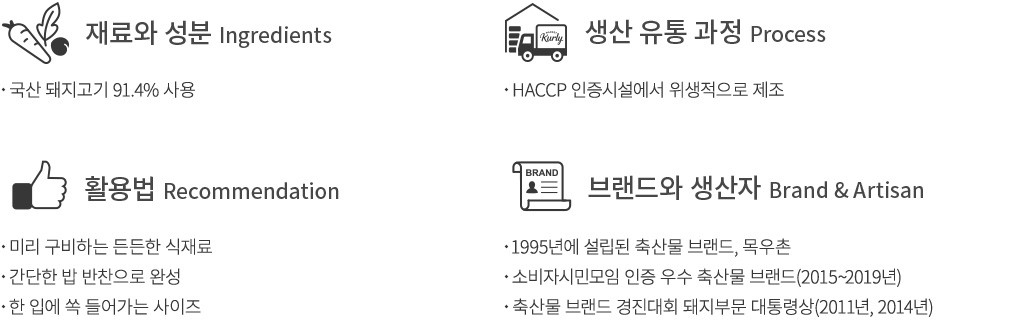 - 돼지고기, 대두, 쇠고기 함유 - 알류, 우유, 밀, 토마토, 닭고기, 조개류와 같은 시설에서 제조