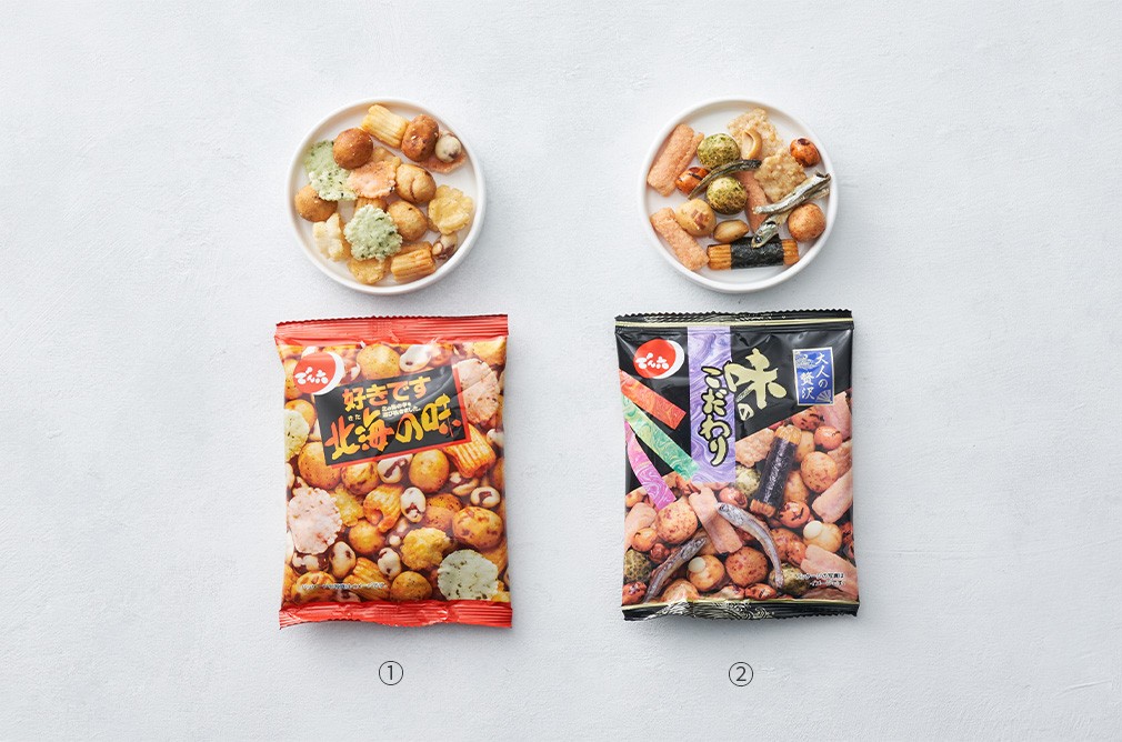 스낵 믹스팩 ・ 구성 : ①키타노 아지(154g / 7개입), ②아지노 코다와리(140g / 7개입)