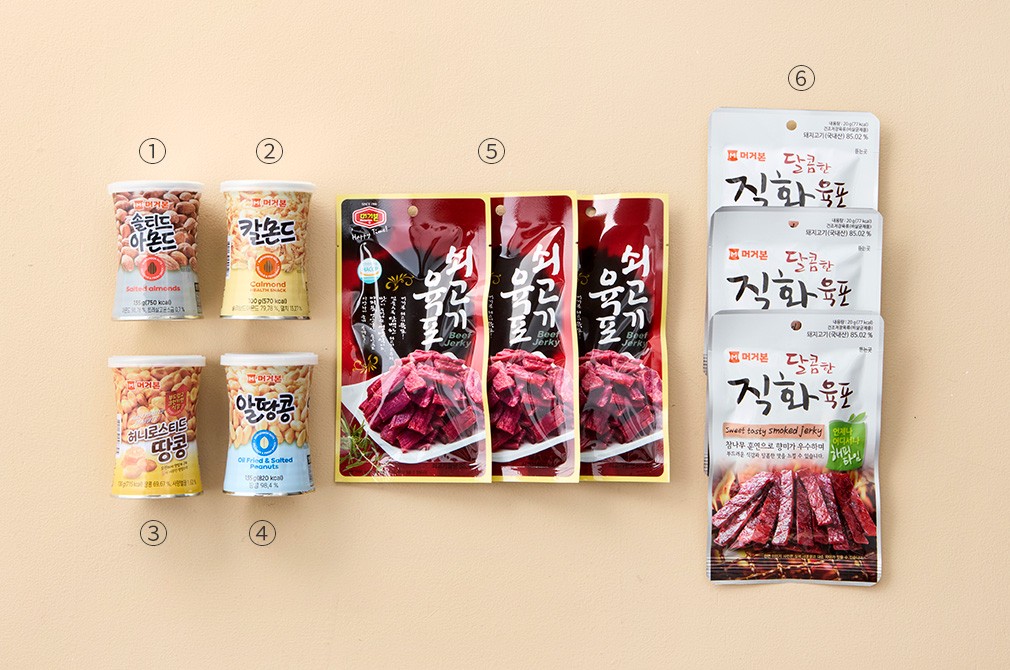 -칼몬드: 밀, 대두 함유 -꿀땅콩: 밀, 땅콩 함유 -군옥수수맛땅콩: 땅콩, 대두, 우유 함유 -쇠고기육포: 쇠고기, 토마토, 우유, 대두, 밀 함유 -직화육포: 돼지고기, 쇠고기, 토마토, 우유, 대두, 밀 함유