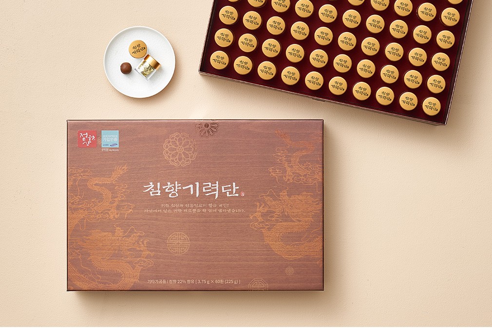 자연의 선물을 한 알에 담은 정원삼의 침향기력단을 만나 보세요. 인도네시아산 침향, 국산 작약 뿌리, 복분자 등 귀한 재료를 꼼꼼하게 엄선했습니다. 정원삼만의 기술로 곱게 갈아 정성 들여 빚어냈고요. 자연에서 얻을 수 있는 영양이 한 알에 모두 담겨 있는 셈이지요. 하루에 1환씩, 물과 함께 꼭꼭 씹어 드셔 보세요. 고급스러운 패키지에 담겨 있으니 감사한 마음을 전하는 선물로도 꼭 알맞을 거예요.