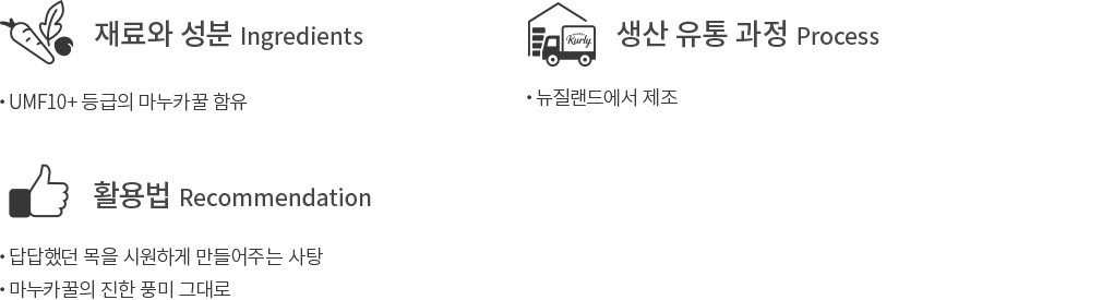 ・특징: 마누카꿀에 프로폴리스 추출물과 페퍼민트 오일을 더해 완성한 사탕입니다. 답답했던 목을 시원하게 만들어줄 거예요.