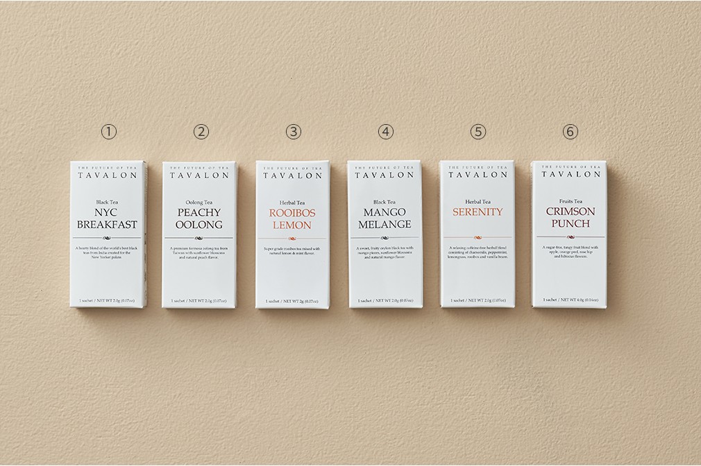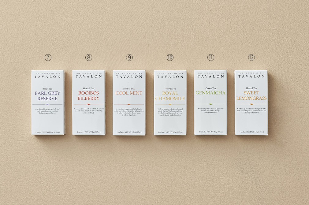 타바론 버라이어티 ・구성 : ①NYC 브렉퍼스트, ②피치 우롱, ③루이보스 레몬민트, ④망고 멜란지, ⑤세레니티, ⑥크림슨 펀치, ⑦얼그레이 리저브, ⑧루이보스 빌베리, ⑨페퍼민트, ⑩로얄 캐모마일, ⑪현미녹차, ⑫스윗 레몬그라스