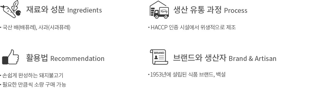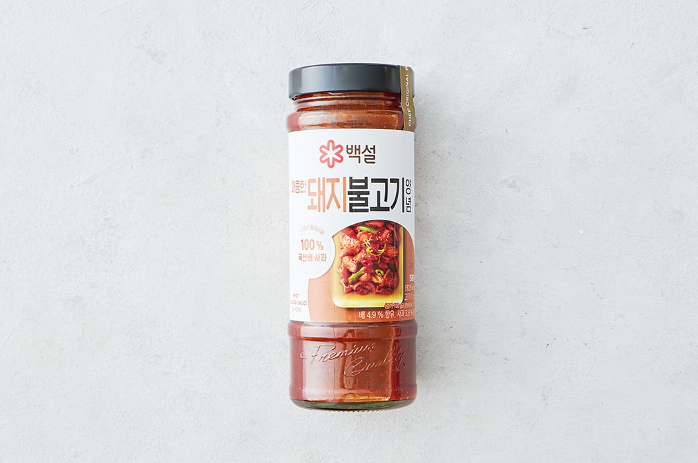 양념 하나만 제대로 구비해 두어도 요리 시간이 확실하게 단축되지요. 백설은 한 병만으로 고기 요리를 완벽하게 만들어 줄 양념을 준비했어요. 국산 배와 사과로 만든 퓨레로 자연스러운 단맛을 더하고, 고추장, 다진 마늘, 청주 등 각종 양념들을 최적의 비율로 배합했답니다. 돼지고기에 넉넉히 부은 후 재워두기만 하면 순식간에 요리 준비가 끝날 거예요. 고기 1kg에 사용할 수 있는 양이니 온 가족을 위해 매콤달콤 돼지 불고기를 준비해보세요.