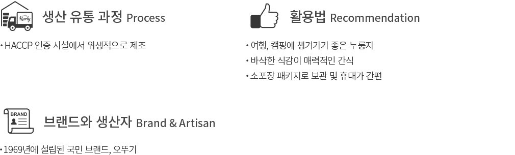 누룽지는 만드는 과정이 은근히 번거로워 자주 먹기엔 어려운 음식이기도 한데요. 밥이 눌어붙기까지 기다릴 필요 없이 간편하게 즐길 수 있는 오뚜기의 옛날 구수한 누룽지를 만나 보세요. 갓 지은 밥을 무쇠 판에 구워내어 꼬들꼬들한 식감과 고소한 맛을 제대로 살렸답니다. 따뜻한 물을 붓고 잠깐 기다리면 부드러운 숭늉으로 즐길 수 있고요. 과자처럼 하나씩 집어먹으면 바삭한 간식으로 안성맞춤이죠. 한 번에 먹기 좋은 양만큼 소포장되어 있으니 여행이나 캠핑에 챙겨가도 좋을 거예요.
