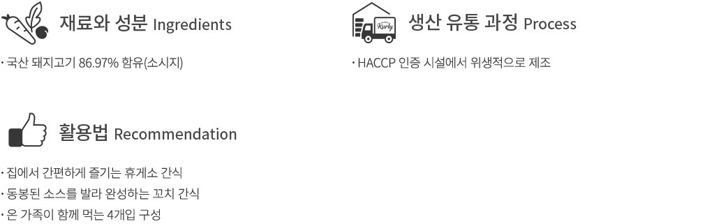 육즙팡팡 소떡소떡 - 돼지고기, 닭고기, 쇠고기, 밀, 대두, 우유 함유 - 달걀, 토마토, 조개류(굴), 아황산류 혼입 가능성 있음 달콤소떡소스/매콤소떡소스 - 쇠고기, 토마토, 밀, 대두 함유 - 우유, 달걀, 메밀, 땅콩, 고등어, 게, 새우, 돼지고기, 복숭아, 아황산류, 호두, 닭고기, 오징어, 잣, 조개류(굴, 바지락, 모시조개, 홍합) 혼입 가능성 있음