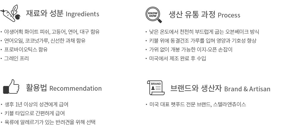・특징 : 화이트피쉬 등 어류 단백질원을 주원료로 하는 사료입니다. 오븐베이크 키블 사료에 동결건조 가루로 코팅해 기호성을 높였어요.