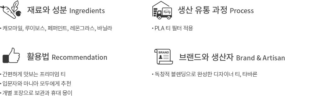 티 소믈리에의 섬세한 블렌딩이 돋보이는 티 브랜드, 타바론의 세러니티를 소개할게요. 타바론의 베스트 티 중 하나인 세러니티는 타바론의 시그니처 블렌딩이에요. 캐모마일을 베이스로 페퍼민트, 레몬그라스, 루이보스, 바닐라를 블렌딩하여 과일 향과 꽃 향이 부드럽게 어우러진답니다. 부담스럽지 않아 하루를 마무리할 때 함께하기에도 좋아요.