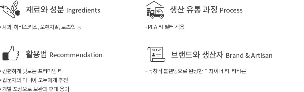 2005년, 뉴욕 맨해튼에서 시작된 타바론은 세계 각지에서 선별된 프리미엄 티를 전문적으로 소개하는 티 브랜드입니다. 타바론 티 소믈리에의 독창적이고 섬세한 블렌딩을 통해 새로운 방식으로 즐기는 프리미엄 티를 전하고 있지요. 타바론은 'The future of tea'라는 슬로건 아래, 보다 편안하게 다가갈 수 있는 티를 만들고자 하는데요. 간편성을 더한 티백 상품 등을 선보이며 끊임없는 연구와 노력을 거듭하고 있답니다. 타바론이 선보이는 따뜻한 티의 세계, 이제 컬리에서 만나 보세요.
