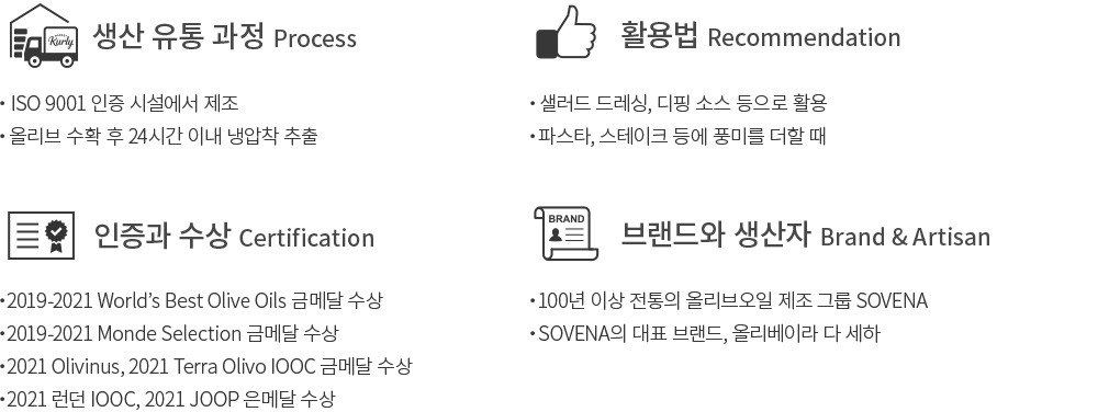 ・특징 : 깊고 부드럽게 숙성된 맛이 일품인 올리브오일입니다. 과일향과 풀맛이 입 안에 잠시 머물고 나면, 엑스트라버진 특유의 톡 쏘는 매콤함이 느껴져요.