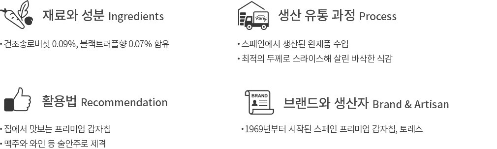 토레스는 1969년부터 시작된 스페인의 프리미엄 감자칩 브랜드예요. 수많은 시도 끝에 찾아낸 감자칩과 소금의 배합 비율로, 다양한 종류의 감자칩을 선보이고 있죠. 지금 만나볼 셀렉타 블랙트러플은 건조 송로버섯을 더해 농후한 향미를 자랑해요. 블랙트러플 고유의 진한 풍미와 짭조름한 감자칩이 알맞은 조화를 이룬답니다. 바삭함을 즐길 수 있는 최적의 두께로 슬라이스해, 마지막 한 입까지 경쾌하게 즐길 수 있어요. 심심한 입을 달래는 간식부터 간단한 맥주, 와인 안주로 선택해 보세요.