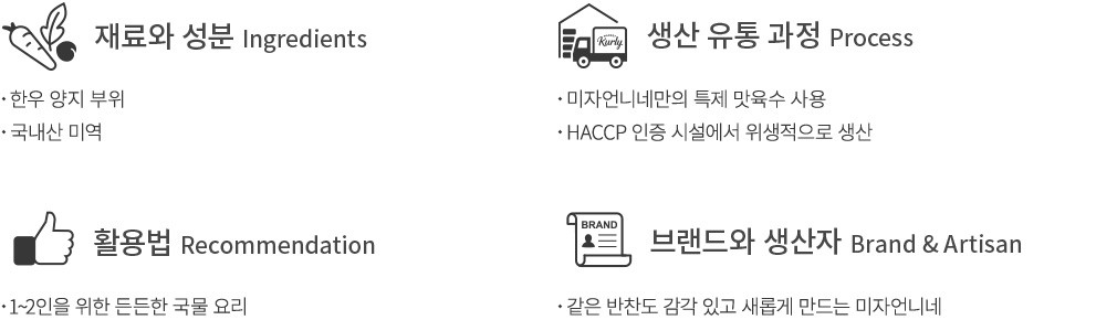 - 쇠고기, 대두, 우유, 밀, 닭고기, 게, 새우, 오징어, 조개류(홍합) 함유 - 돼지고기, 조개류(굴, 전복 포함) , 토마토, 알류, 땅콩, 호두, 잣, 고등어, 아황산류를 사용한 제품과 같은 제조시설에서 제조.