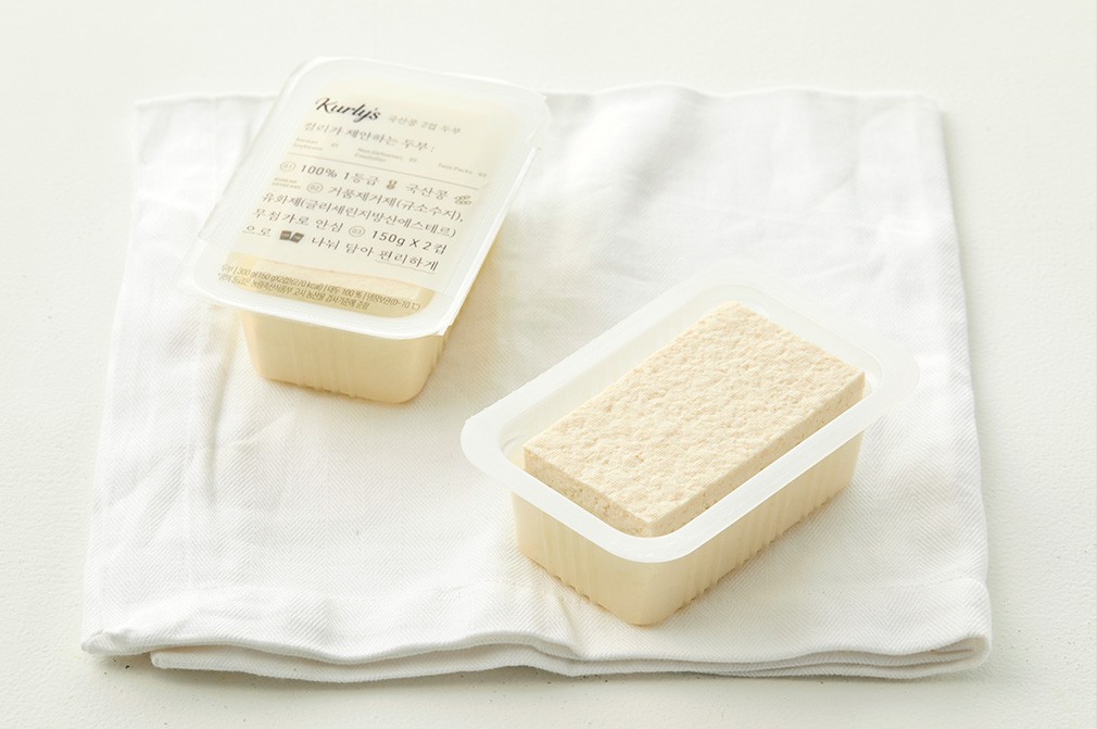 너무 부드럽지도, 너무 단단하지도 않은 두부의 탄탄한 질감에도 컬리스의 생각이 담겨 있어요. 두부는 보통 한 번 요리할 때 한 모를 다 쓰지 않고, 여러 요리에서 다양한 방법으로 조리하게 되는 만큼 찌개용과 부침용을 모두 커버할 수 있어야 더 쓰임새가 좋다고 생각했죠. 두부를 꺼내거나 자를 때 말캉하지 않고 힘이 있다고 느껴지실 거예요. 표면도 매끄럽지 않고 손두부처럼 투박한 질감이 조금 살아있습니다. 하지만 현미유를 사용해 먹을 때는 부드러운 식감이 나도록 만들었어요.