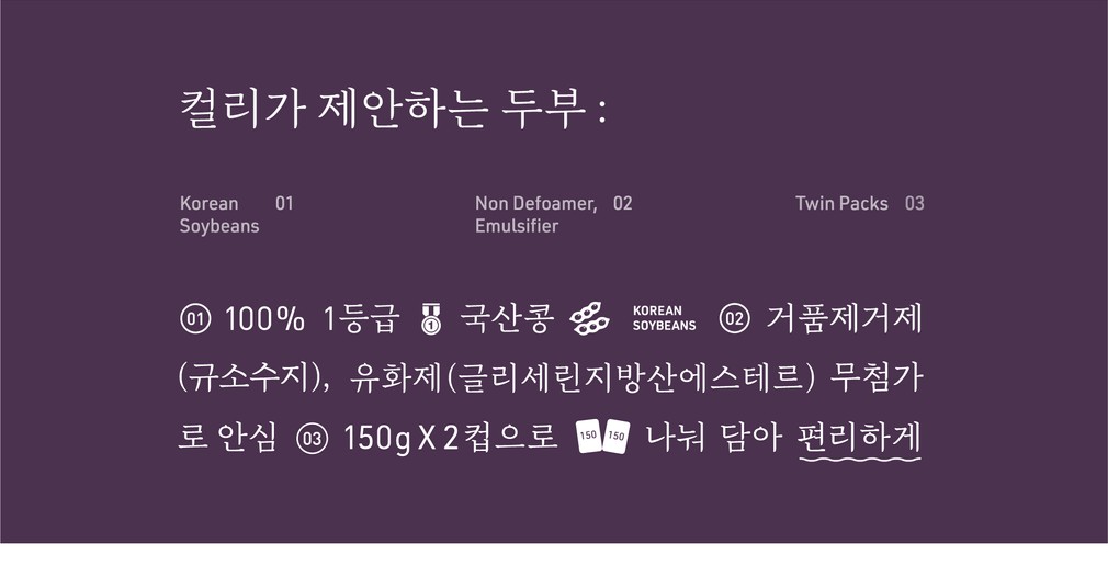 정직한 재료로 만든 탄탄함, 고소함 컬리스 국산콩 두부는 콩물에 얇은 기름막을 형성해 응고 속도를 조절하는 유화제, 글리세린지방산에스테르와 콩물을 끓일 때 발생하는 거품을 제거하기 위한 거품제거제, 규소수지를 사용하지 않았어요. 대신 해수에서 추출한 응고제인 조제해수염화마그네슘을 사용해 더 안심하고 즐기실 수 있게 만들었습니다.