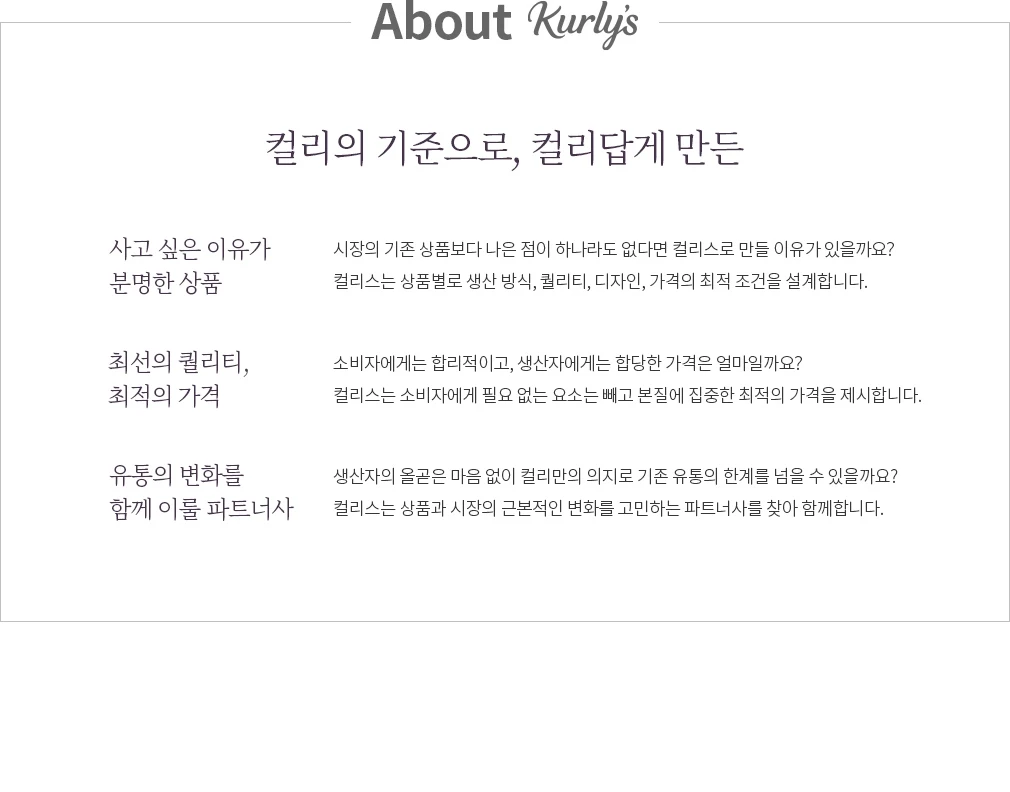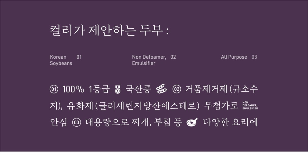 정직한 재료로 만든 탄탄함, 고소함 컬리스 국산콩 두부는 콩물에 얇은 기름막을 형성해 응고 속도를 조절하는 유화제, 글리세린지방산에스테르와 콩물을 끓일 때 발생하는 거품을 제거하기 위한 거품제거제, 규소수지를 사용하지 않았어요. 대신 해수에서 추출한 응고제인 조제해수염화마그네슘을 사용해 더 안심하고 즐기실 수 있게 만들었습니다.