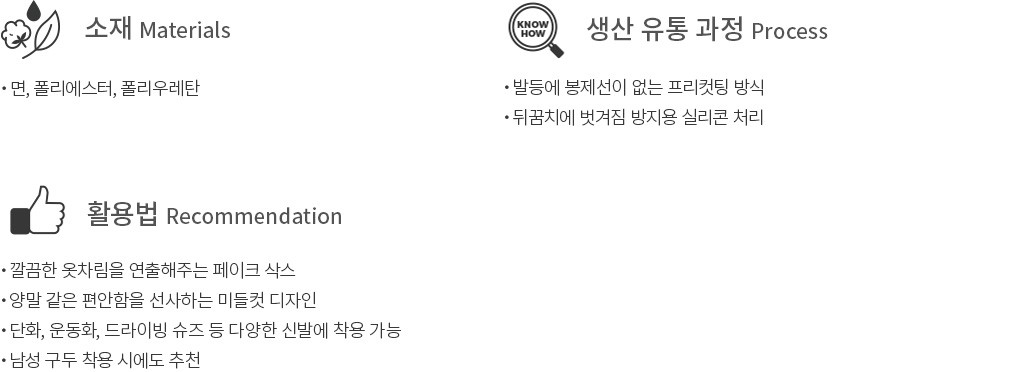 컬리가 양말 같은 편안함과 페이크 삭스의 역할을 모두 지닌 ‘미들컷 페이크 삭스’를 준비했습니다. 발목이나 발등 등 보이는 부분은 덮지 않으면서도 페이크 삭스와 달리 양말같은 봉제 설계로 발을 안정감 있게 감싸준답니다. 특히, 봉제선이 없어서 피부에 밀착되는 느낌이 아주 편안해요. 힐 뿐만 아니라 로퍼, 단화, 슬립온, 운동화, 드라이빙 슈즈 등을 신을 때에도 착용 가능하답니다.