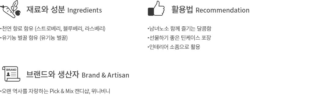 ・ 특징 : 싱그러운 라스베리의 향과 맛을 느낄 수 있는 캔디가 틴케이스 안에 담겨있어요.