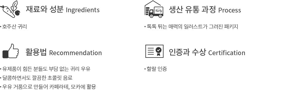 ・ 특징 : 호주산 귀리로 만든 식물성 음료에 코코아 분말을 더해 완성했어요. 그대로 드시거나 우유 거품으로 만들어 라테, 모카 등에 활용해 보세요.