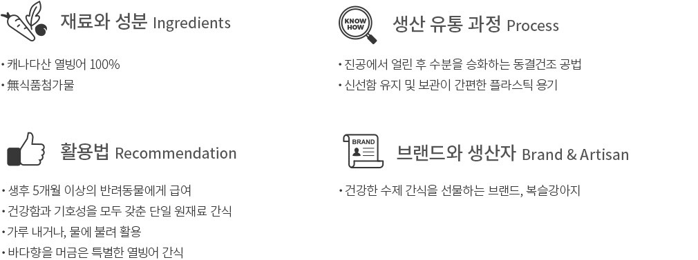 작은 한 알 한 알마다 원재료의 영양이 그대로 들어있는 동결건조 간식. 아마 가장 간편하게 급여할 수 있는 원물 간식일 거예요. 원재료를 진공상태에서 얼린 후 수분을 승화시켜 만들어서 그냥 테이블 위에 올려놓아 보관할 수 있고요. 물에 촉촉이 불려서 급여할 수도 있죠. 이 제품은 100% 캐나다산 열빙어를 동결건조한 간식으로, 염분을 충분히 제거한 뒤 만들었답니다. 바다의 향을 가득 머금은 별미임은 물론, 뼈째 먹는 음식이기 때문에 칼슘 역시 섭취할 수 있답니다.