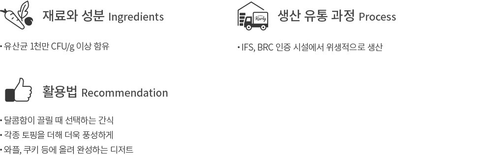 - 우유 함유 - 계란, 땅콩, 대두, 밀, 복숭아, 아황산류, 호두 혼입가능