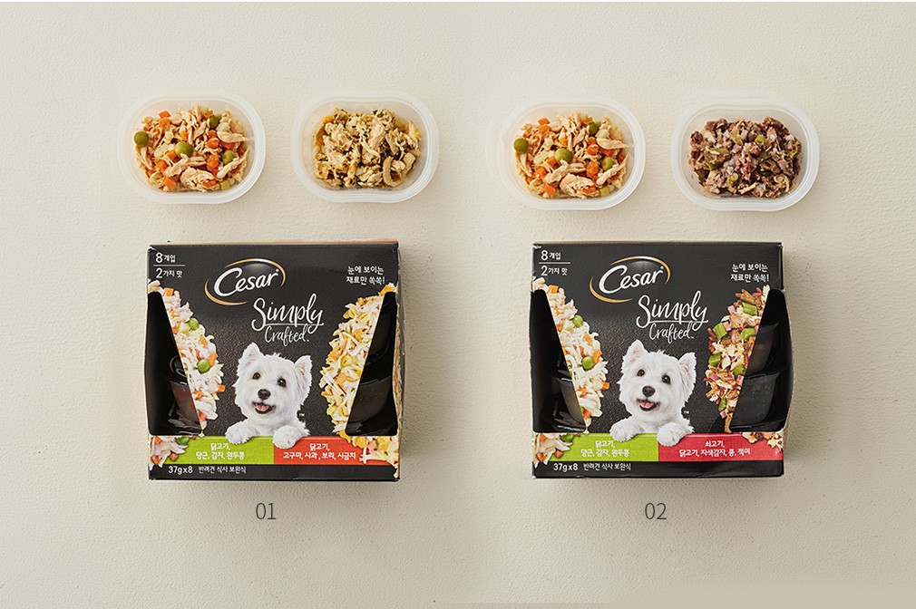 그 유명한 시저 캔이 고기향이 듬뿍나는 참기 힘든 맛있는 간식이라면, 지금 소개하는 심플리 크래프티드는 손으로 손질한 원재료를 그대로 담은 간식이에요. 반투명한 패키지를 들여다보면 무슨 재료가 들었는지 훤히 들여다 보이죠. 두가지 맛을 4개씩 넣은 상품 2종을 준비했어요. 닭고기와 쇠고기로 구성된 것과, 닭고기만으로만 구성된 것 중 선택해 보세요.