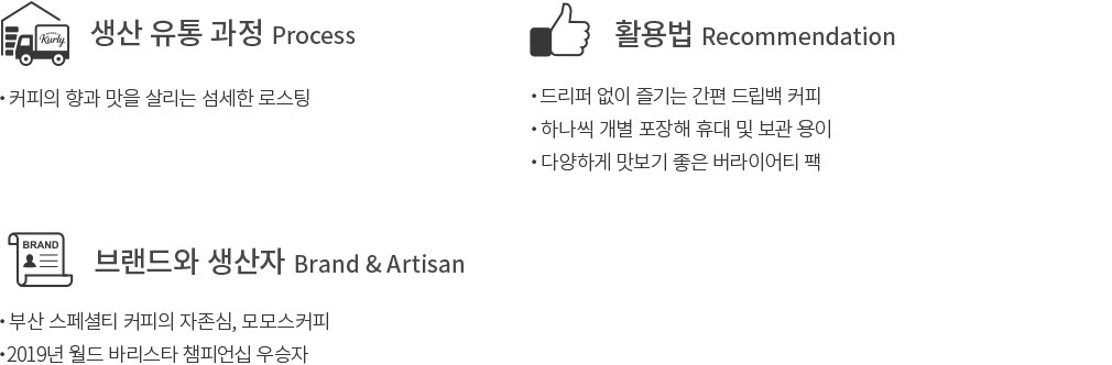 ・특징 : 붉은 보랏빛 수채화가 연상되는 베리 풍미를 지닌 블렌드 드립백입니다. 초콜릿을 닮은 묵직한 단맛으로 훌륭한 밸런스를 완성했어요.