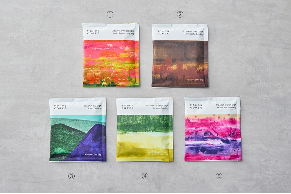 버라이어티 드립백 ・구성 : ①프루티 봉봉, ②에스 쇼콜라, ③부산, ④에티오피아 레도 마운틴, ⑤므쵸베리