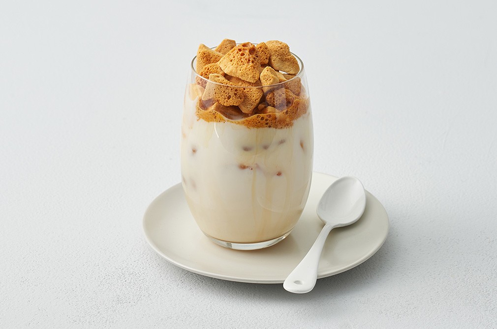 이렇게 즐겨보세요 ・ 우유, 얼음을 컵에 담고 달고나를 토핑으로 올려 달고나 라떼로 즐겨보세요. 취향에 따라 커피를 더해도 좋답니다.