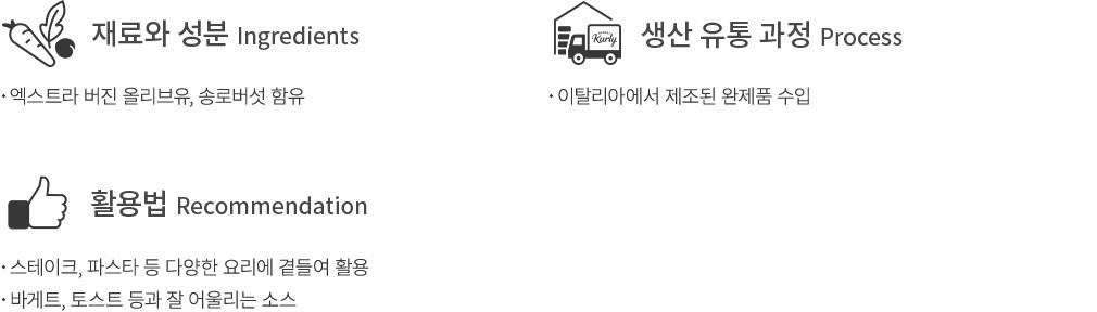 양송이 버섯과 블랙 올리브 절임에 송로 버섯을 더해 완성한 아르티지아니의 트러플 소스를 만나 보세요. 올리브가 가진 향긋함과 함께 송로버섯의 우아한 풍미가 어우러져 다채로운 매력을 자랑한답니다. 스테이크나 파스타 등 트러플 향을 더하고 싶은 요리에 살짝 곁들여 보세요. 바게트, 토스트 등의 빵과 함께 드시거나 카나페로 만들어 보아도 좋아요. 어디든 아르티지아니의 트러플소스를 더하면, 요리의 매력이 한층 더 살아날 거예요.