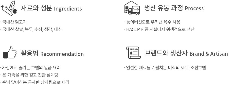 - 닭고기 함유 * 알류, 메밀, 땅콩, 우유, 대두, 밀, 고등어, 게, 새우, 돼지고기, 복숭아, 토마토, 아황산류, 호두, 쇠고기, 오징어, 조개류(굴, 전복, 홍합 포함), 잣을 사용한 제품과 같은 제조시설에서 제조