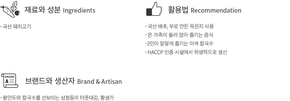 종로구 삼청동에 위치한 황생가는 낮은 돌담, 소담한 목제 건물이 삼청동의 고즈넉한 분위기와 잘 어울리는 칼국수, 왕만두 전문점입니다. 입구에 들어서면 손 빠르게 만들어지는 왕만두가 가장 먼저 반겨오는데요. 매일 아침, 시장에서 공수해오는 재료로 그때그때 빚어내기 때문에 신선한 재료의 맛과 식감이 고스란히 살아 있는 것이 특징이랍니다. 합리적인 가격과 훌륭한 맛을 두루 갖춘 곳에 부여하는 미쉐린가이드 빕 구르망에 5년 연속 선정되었다는 점이 이 가게의 명성을 뒷받침해주죠. 언제나 문전성시를 이루는 삼청동 터줏대감, 황생가의 음식을 이제 가정에서 편히 만나보세요.