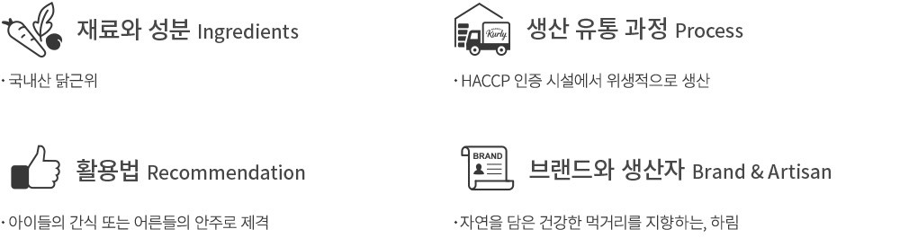 * 닭고기, 밀, 대두 함유 * 본 제품은 돼지고기, 쇠고기, 우유, 알류, 새우, 오징어, 땅콩, 토마토, 아황산류, 조개류(굴, 홍합, 전복 포함)를 사용한 제품과 같은 제조시설에서 제조하고 있습니다.