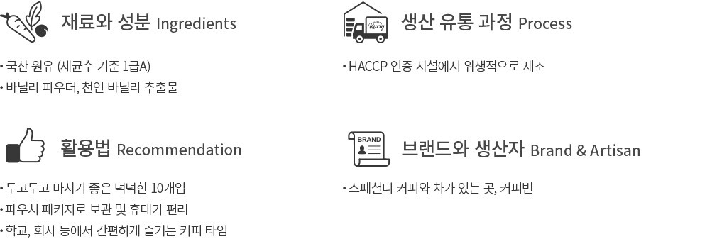 - 우유, 대두 함유 - 메밀, 땅콩, 복숭아, 토마토, 알류, 밀, 호두, 돼지고기, 쇠고기, 잣을 사용한 제품과 같은 제조시설에서 제조