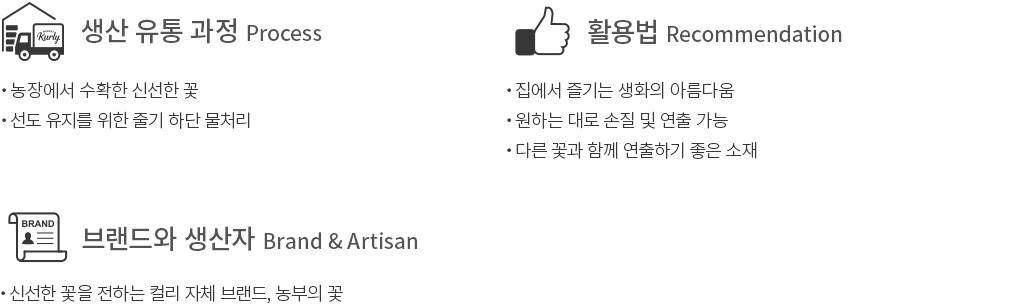 신선식품 특성상 원물마다 크기 및 형태가 일정하지 않을 수 있습니다. 수령 직후 바로 물에 담가 둘 수 없는 경우, 포장 상태 그대로 어둡고 서늘한 곳에 보관을 권장드립니다. 반드시 생수 또는 정수기 물 사용을 권장드립니다.더불어 물의 수위가 높을 경우 줄기가 무를 수 있어 너무 깊지 않은 물에 담가주세요.