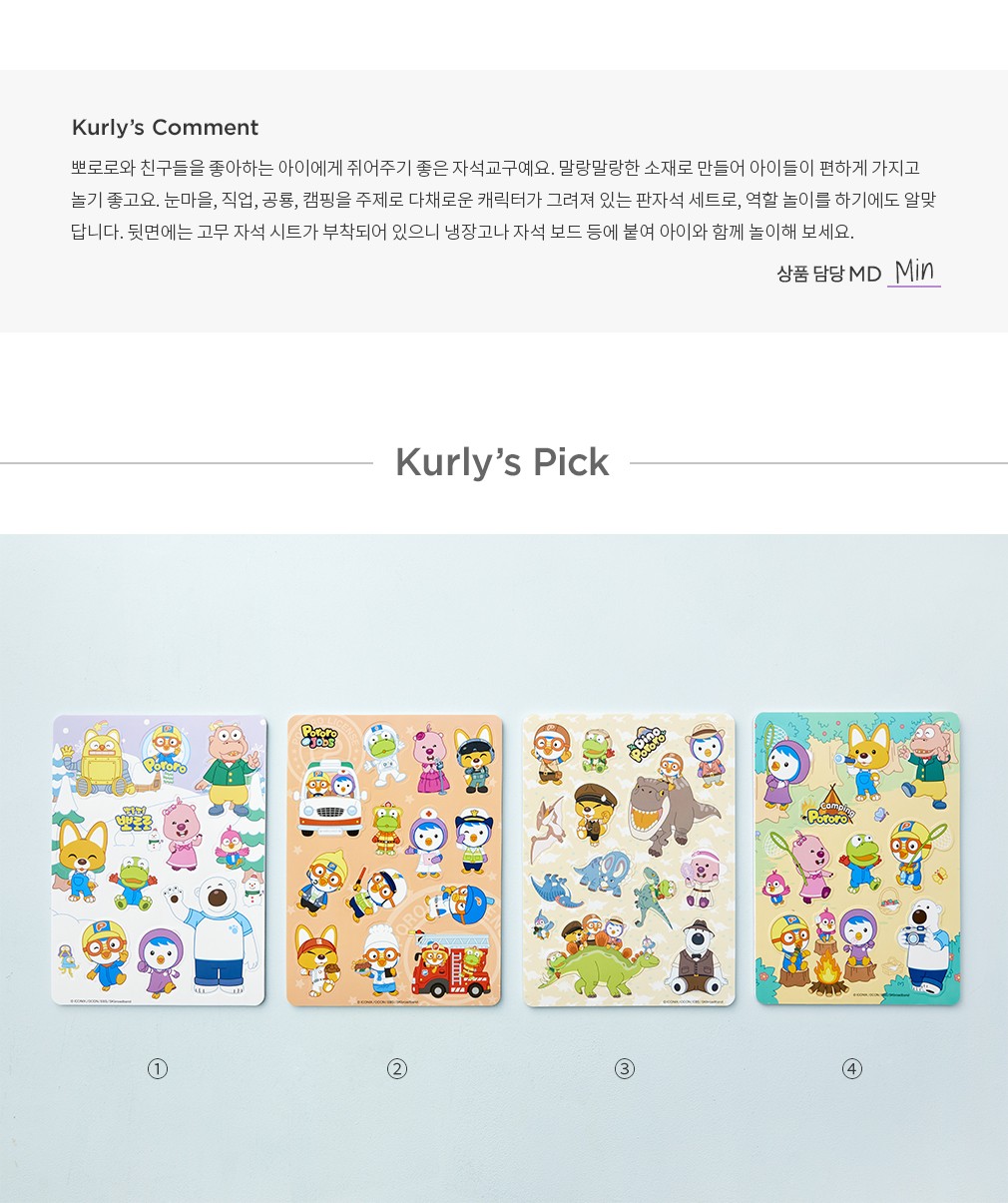 ・구성 : ①뽀로로 판자석 눈마을, ②뽀로로 판자석 직업, ③뽀로로 판자석 다이노, ④뽀로로 판자석 캠핑