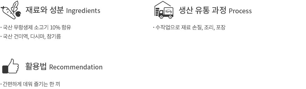- 쇠고기, 대두 함유 - 본 제품은 돼지고기, 닭고기, 난류(계란), 조개류(전복, 꼬막), 오징어, 고등어, 새우, 밀, 땅콩, 호두, 우유, 토마토를 사용한 제품과 같은 제조시설에서 제조하고 있습니다.
