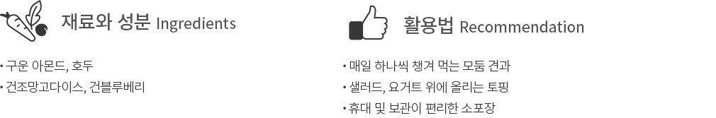 - 호두, 무수아황산(산화방지제) 함유 - 본 제품은 난류, 우유, 메밀, 잣, 땅콩, 대두, 밀, 고등어, 게, 새우, 돼지고기, 복숭아, 토마토, 닭고기, 쇠고기, 오징어, 조개류(굴, 전복, 홍합 포함)를 사용한 제품과 같은 생산시설에서 포장하였습니다.