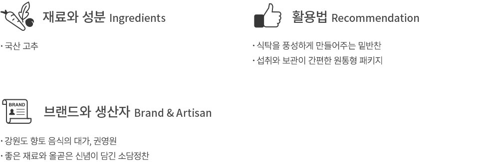 강원도 향토 음식의 대가인 권영원 님의 손길이 닿은 요리로 장아찌를 빼놓을 수 없어요. 우리 땅에서 난 원재료 위주로 사용하는 것부터 각별한데요. 재료 본연의 신선함을 잃지 않으면서도, 제대로 담근 숙성 음식만의 깔끔한 감칠맛이 깊숙이 배어 있기에 입맛을 끌어당기기에 충분하죠. 그중 씹는 즐거움과 입안을 개운하게 적셔줄 고추 장아찌를 컬리에서 만나보세요. 갓 딴 고추를 간장 소스에 담가 푹 숙성하여 담아냈답니다. 육류요리의 곁들이는 물론 입맛을 돋워줄 별미 반찬으로 제격일 거예요.