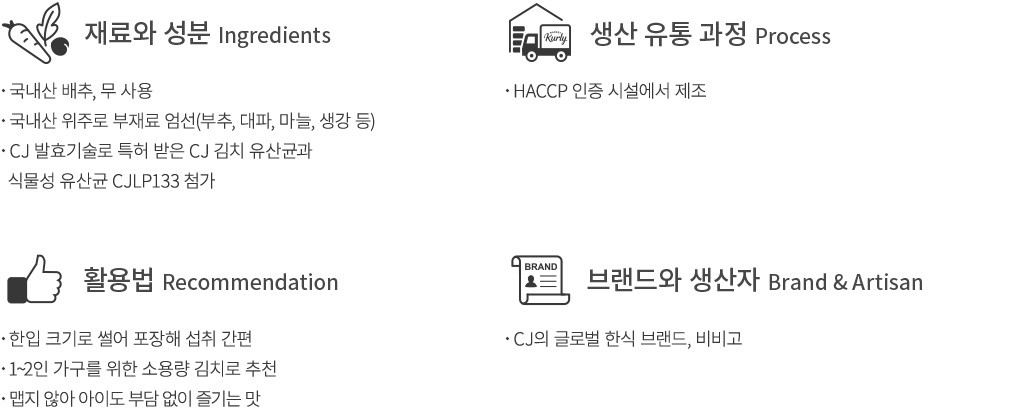 ・특징 : 사과와 배를 갈아 넣어 매운 맛을 줄인 아이 전용 김치입니다.